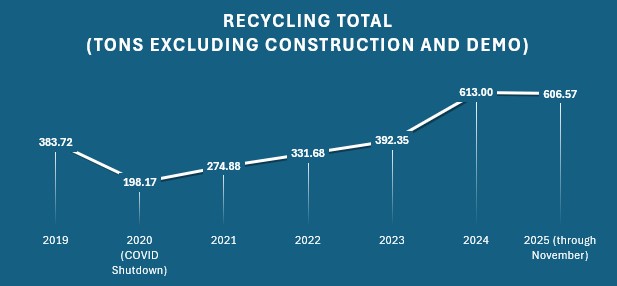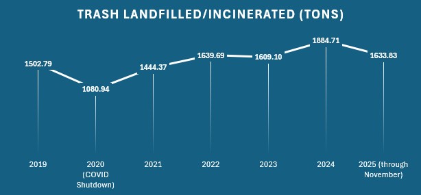 The data listed below shows a breakdown of our waste/recycling totals from 2020-2024. Waste generation, especially trash volume, was lower in 2020 due to the impacts of COVID 19.